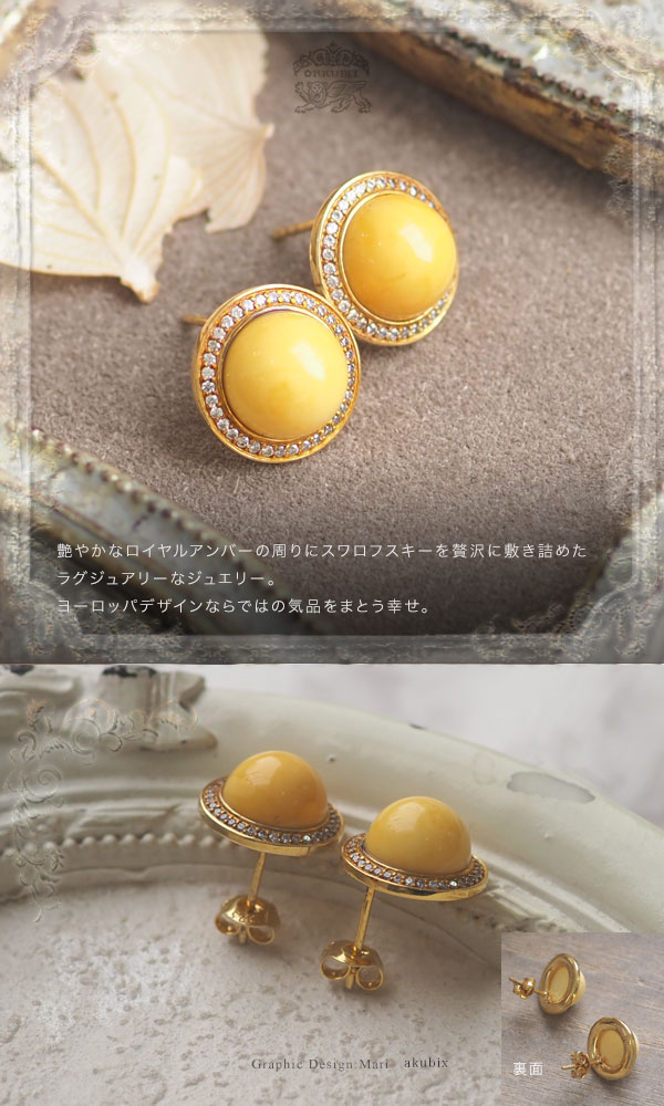 インターナショナルアンバー協会認定正規品 /原産地:ポーランド共和国 /宝石:天然琥珀・スワロフスキー /琥珀サイズ:φ約10×h7mm /モチーフサイズ:φ約14mm /ポスト:長さ11mm 、太さ0.8mm /金属:K18ゴールドヴェルメイユ /ケース・保証書付 /プレゼントラッピング別途700円 【ヴェルメイユ(vermeil)技法】 ヴェルメイユとは純度925または800のシルバーをゴールドの層で覆った貴金属を指します。