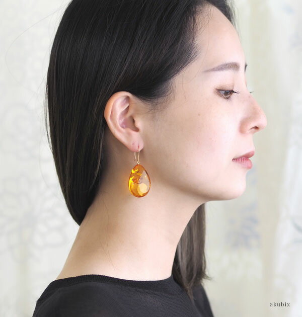 本当にきれいな琥珀だからできるシンプルなK18ゴールドピアス。