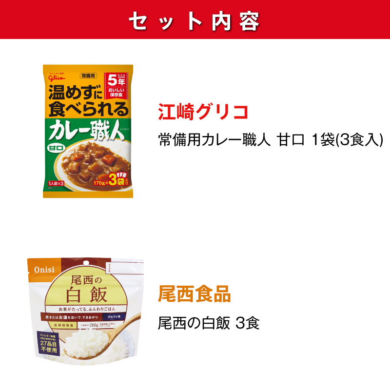5年保存 非常食 江崎グリコ 常備用カレー職人 1袋3食入り 甘口 尾西の白飯 3食 セット