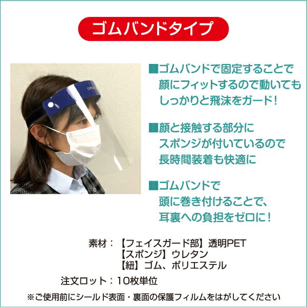 【スタンダードフェイスシールド(ゴムバンドタイプ)(1セット10枚入り)】 視界を遮らずに顔周りをウイルスをきっちりガードするフェイスシールド。