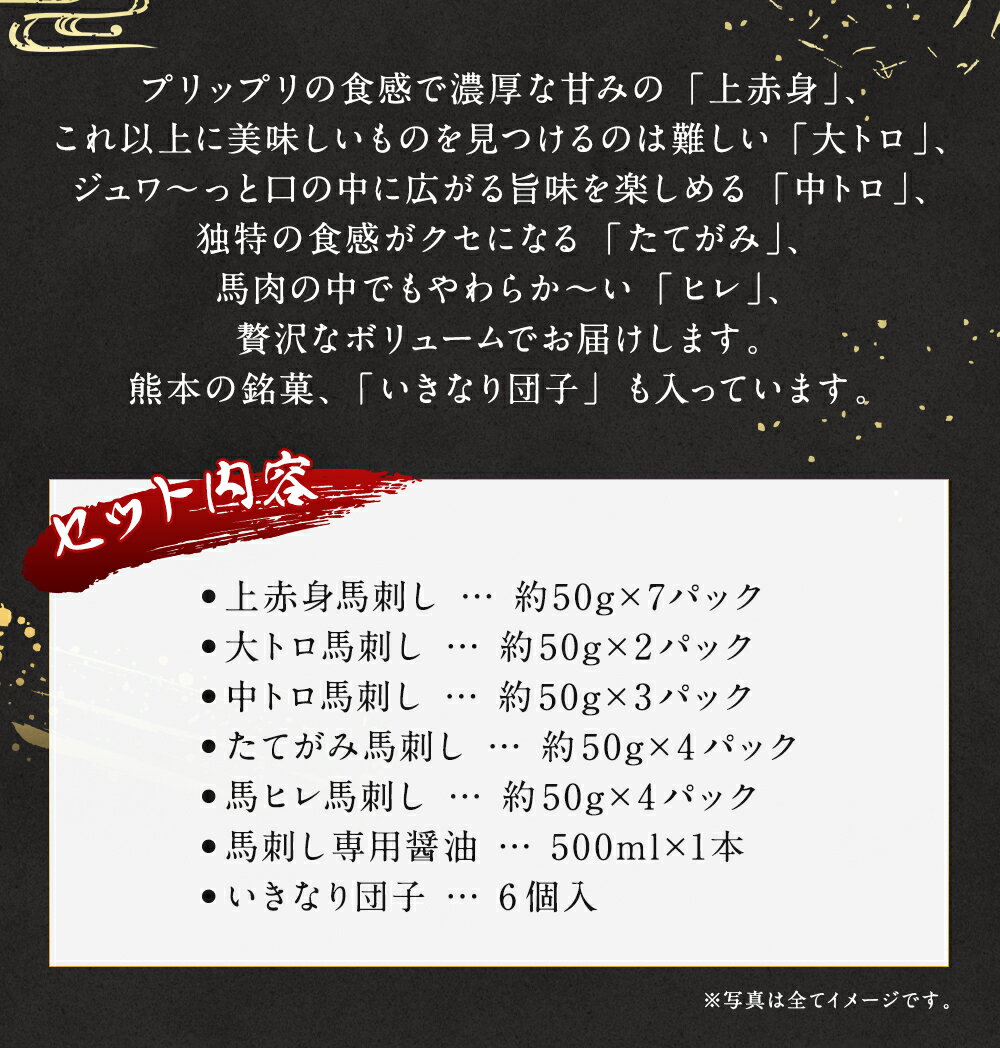 【ふるさと納税】馬刺し 上赤身 ブロック 国産 熊本 計400g 中トロ馬刺し約50g×4パック/大トロ馬刺し約50g×4パック/馬刺し専用醤油80ml×1本 冷凍 生食用 専用醤油 【国産】最高級馬刺し「寿セット」+いきなり団子
